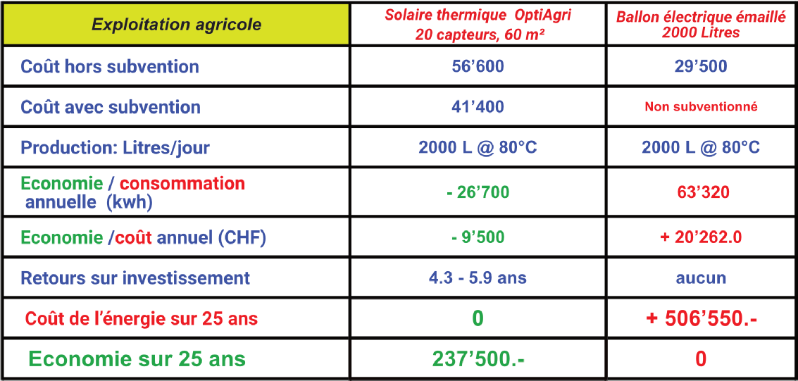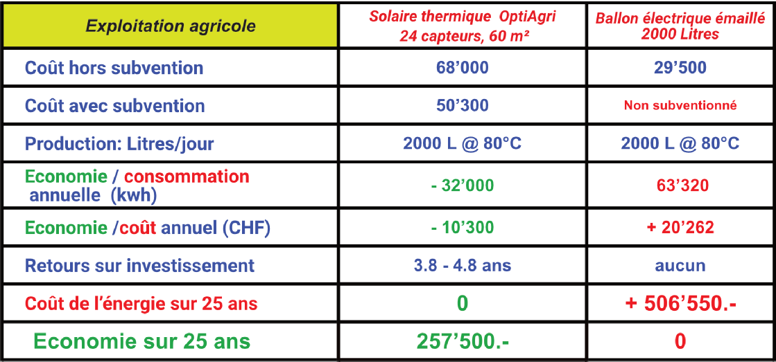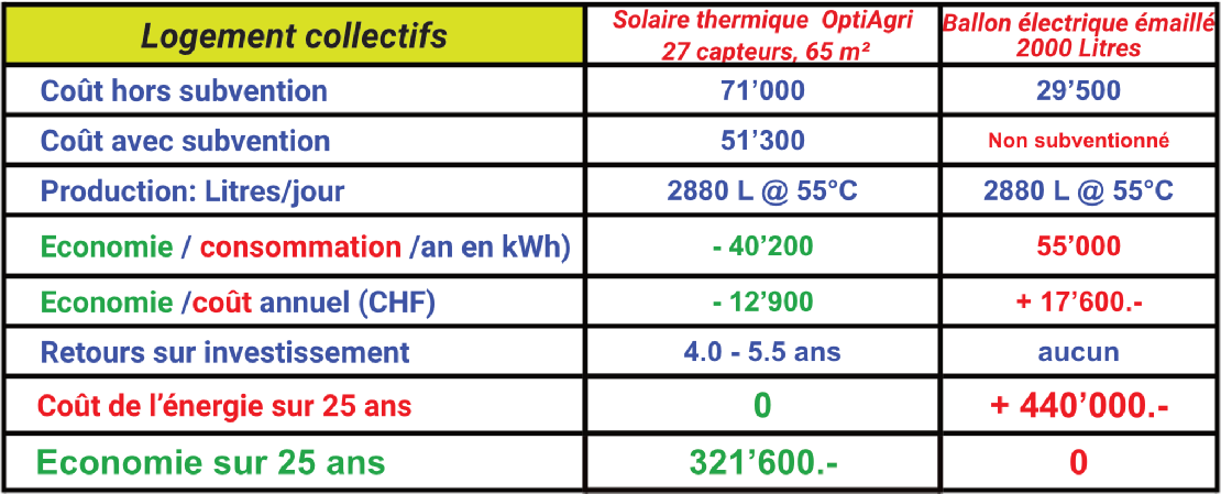 Economie annuelle d’énergie : 6’572 kWh, par rapport à une installation avec un boiler électrique.