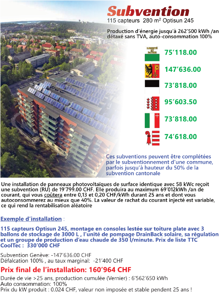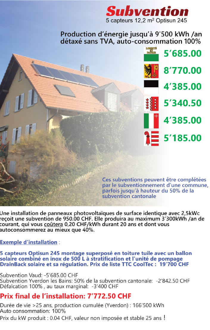 Les montants des subventions sont donnés à titre indicatif en se basant sur les capteurs solaires de notre programme de vente, état au 1er janvier 2025. Ces montants peuvent varier notamment si votre commune porte le label cité de l’énergie, permettant des subventions additionnelles Voir : https://www.energiestadt.ch/