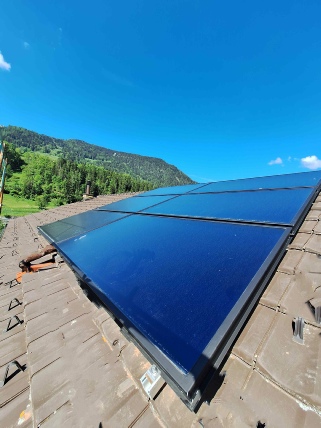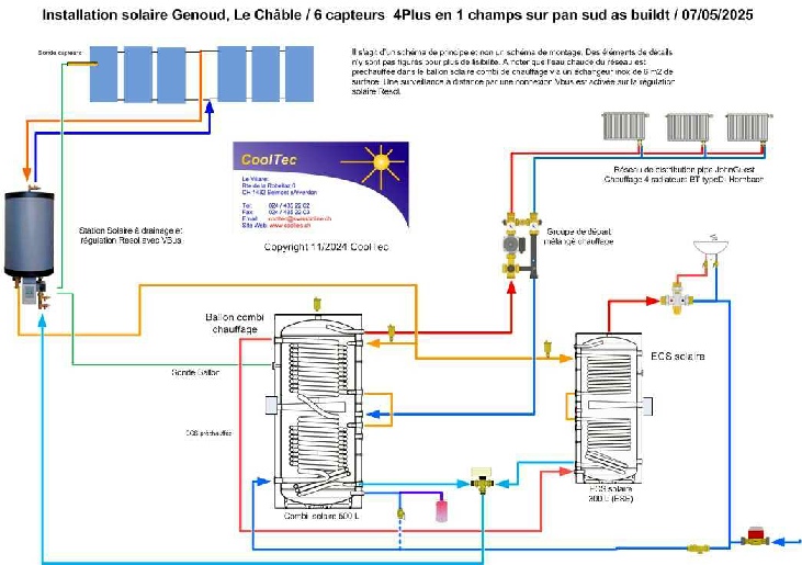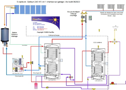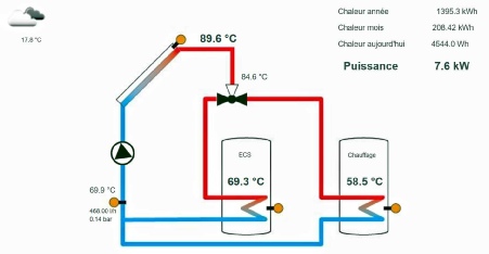 Utilisation complète de la production solaire thermique pour la production de l’eau chaude sanitaire avec un appoint au chauffage via 4 radiateurs basse température. Futur appoint au chauffage avec PAC possible.
