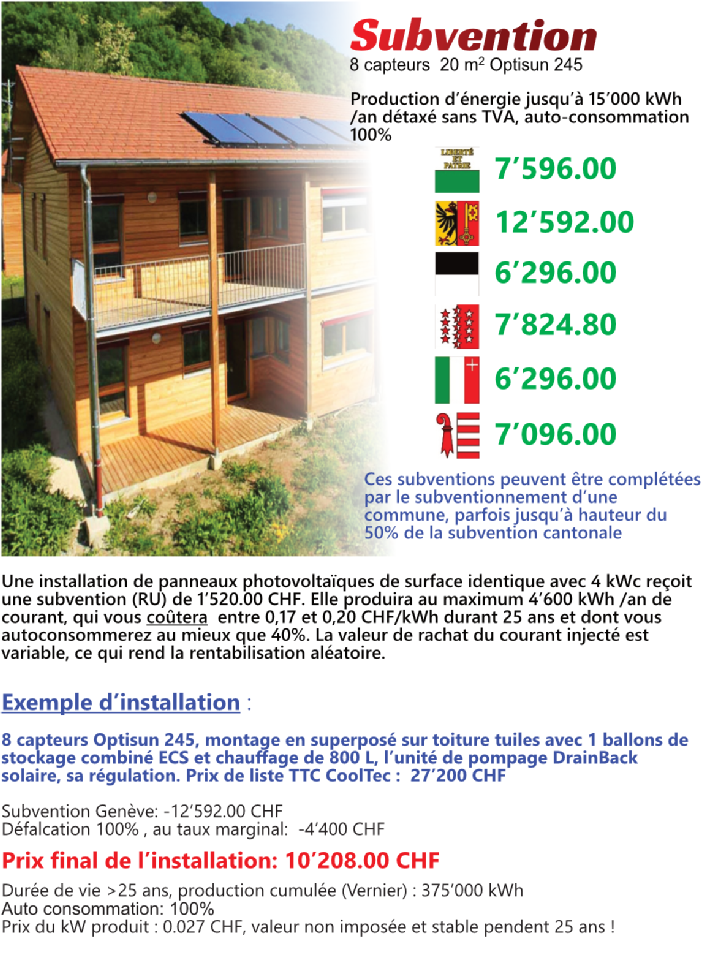 Les montants des subventions sont donnés à titre indicatif en se basant sur les capteurs solaires de notre programme de vente, état au 1er janvier 2025. Ces montants peuvent varier notamment si votre commune porte le label cité de l’énergie, permettant des subventions additionnelles Voir : https://www.energiestadt.ch/