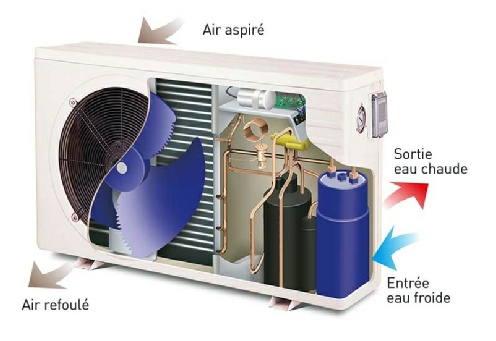 Si on met en route le compresseur, le gaz friorigène est aspiré depuis l’évaporateur, puis compressé , il se transforme en liquide et redonne la chaleur qu’il a « absorbé » dans l’évaporateur. Il passe ensuite dans une chicane ou il se transforme en gaz et repasse dans l’échangeur de chaleur, il réabsorbe de la chaleur qui vient de l’environnement (air, sol, eau), puis est de nouveau aspiré par le compresseur, et le cycle recommence.