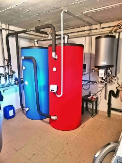Pour cette installation il à fallut: démonter l'ancienne chaudière, poser 2 ballons de stockage, installer une PAC, raccorder sur l’ancienne distribution de chauffage, et faire le remplacement et l’extension du réseau hydraulique existant.
