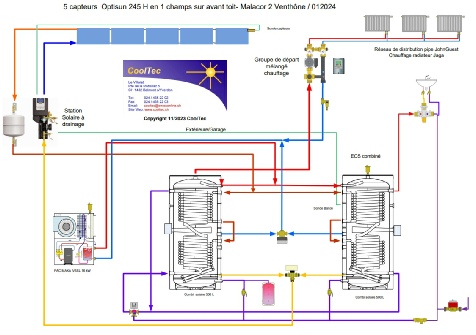 Utilisation complète de la production solaire thermique pour la production de l’eau chaude sanitaire avec un appoint au chauffage via 4 radiateurs basse température. Futur appoint au chauffage avec PAC possible.