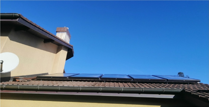 Installation solaire composée de 6 capteurs intégrés, pour la production d’eau chaude sanitaire et chauffage, en complément d’une PAC DC Inverter.
