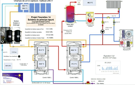 Couverture solaire > 18 %, Utilisation optimale de la production thermique et diminution de la consommation énergétique de la PAC et de l’appoint gaz.