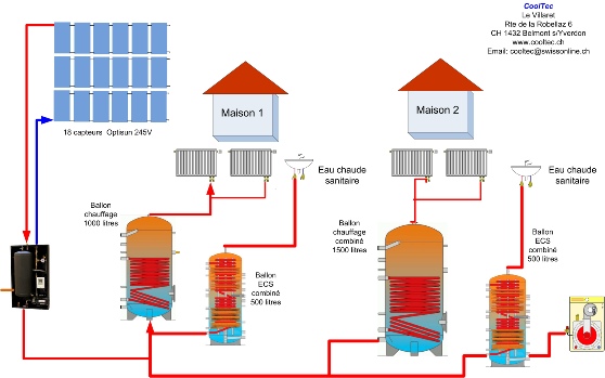 Utilisation optimale combinée du solaire thermique pour la production d’eau chaude sanitaire et un appoint au chauffage pour deux bâtiment distants.