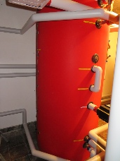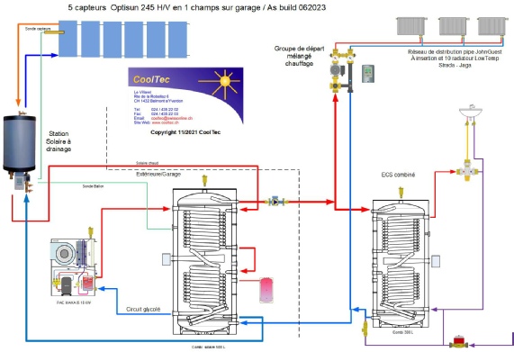 2 ballon de stockage de chaleur, un de 500 litres pour l’ECS et un ballon combiné de 800 litres pour la production d’eau chaude de chauffage et le prechauffage de l’ECS via échangeur INOX sans légionelle.